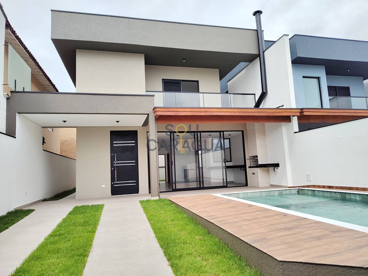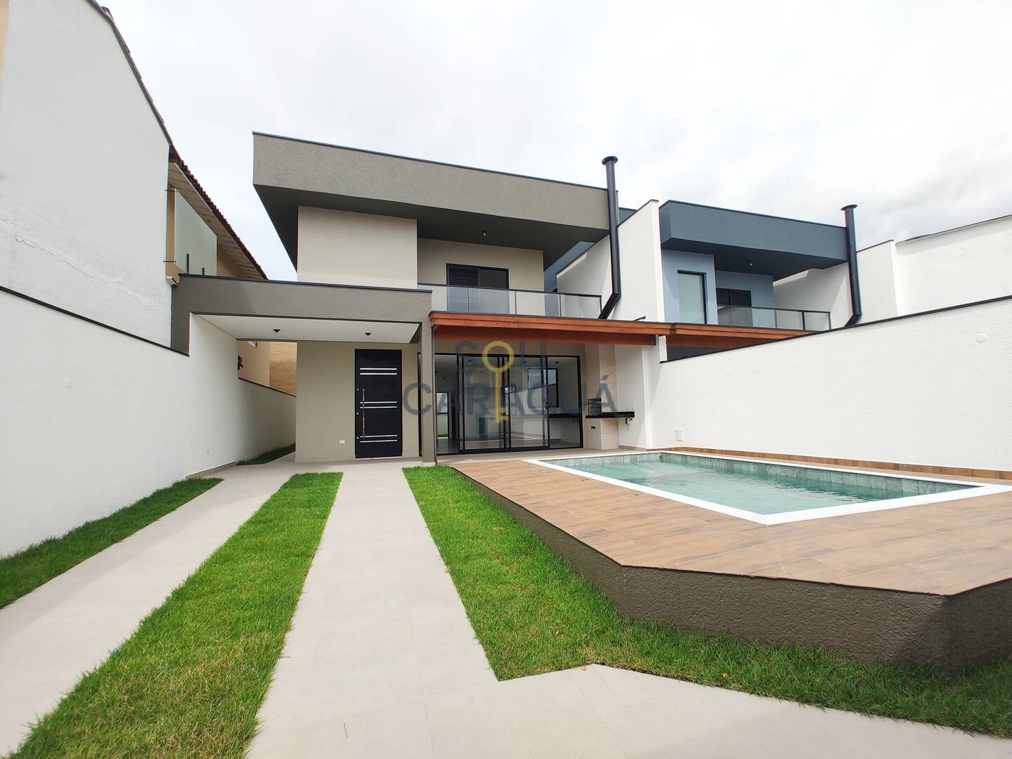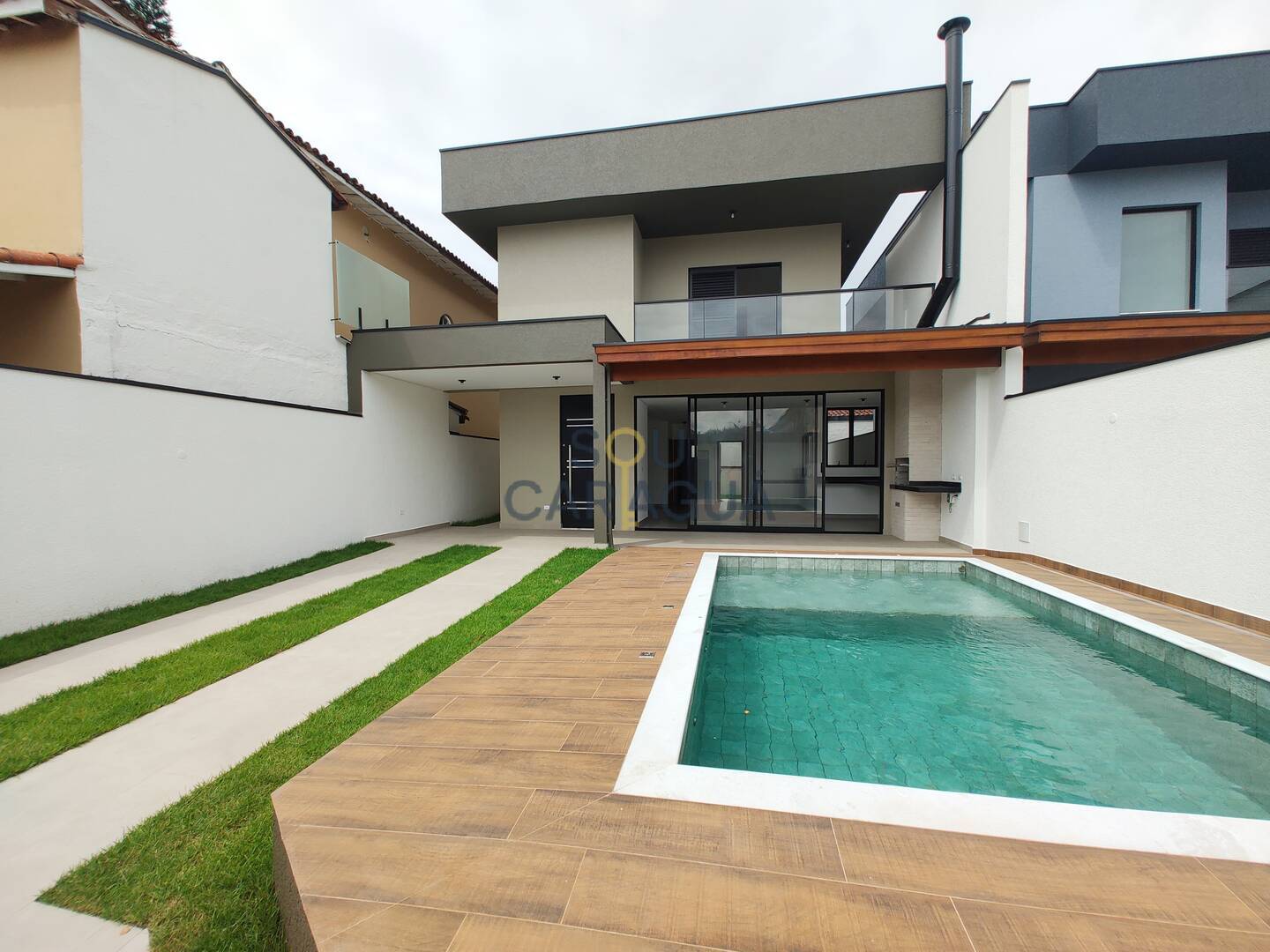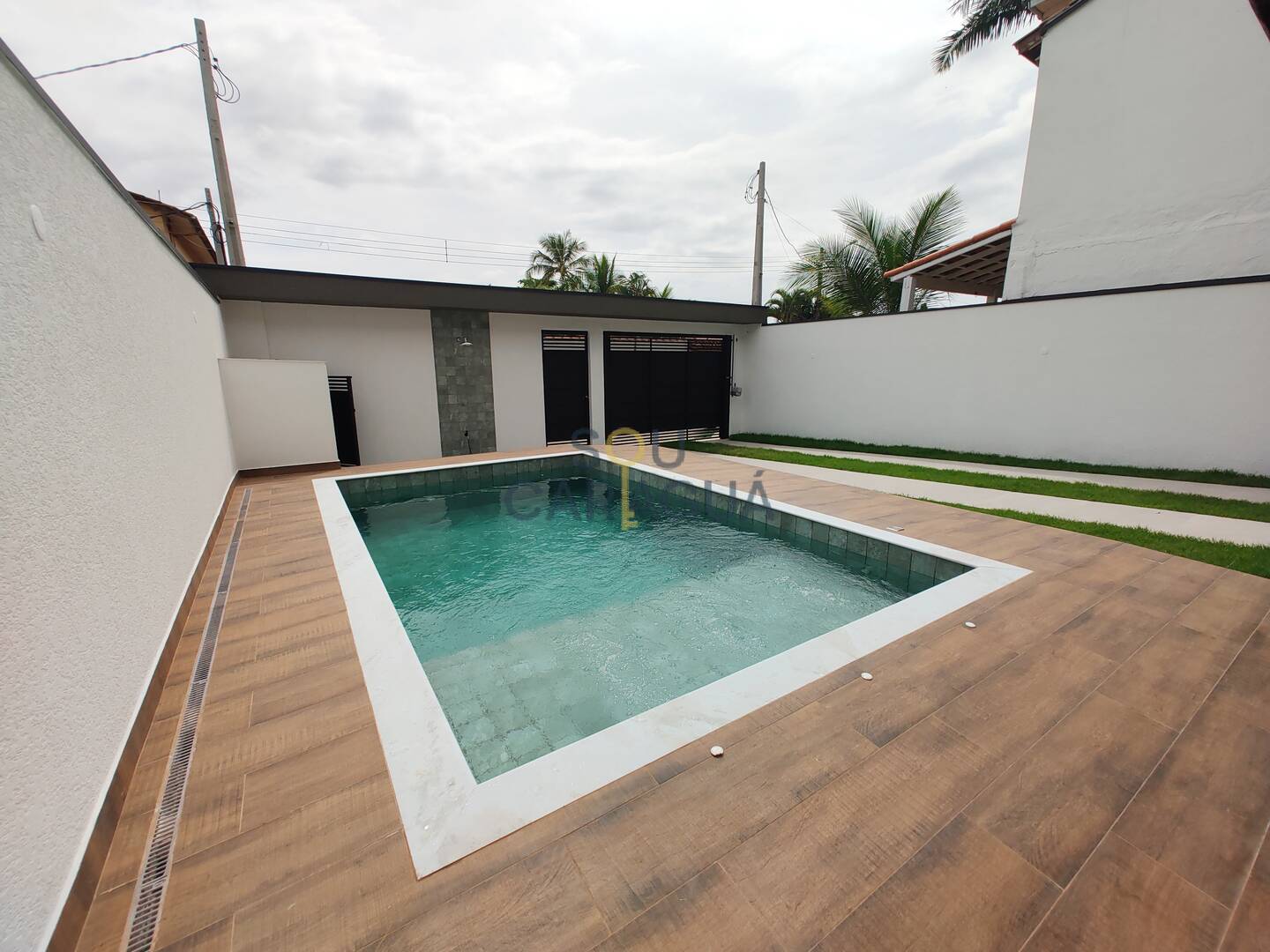 A cozinha em conceito aberto é integrada à área gourmet com churrasqueira a carvão, perfeita para receber amigos e familiares. A área externa conta com uma bela piscina com prainha, quintal parcialmente gramado e espaços laterais e nos fundos livres, garantindo maior privacidade e ventilação natural.
